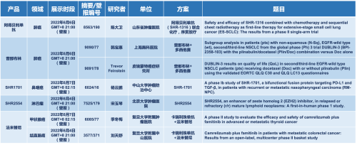 2022 ASCO年会另有5款918搏天堂上市前抗肿瘤创新药的相关研究被接收为壁报,包括SHR-1316、普那布林、法米替尼、SHR-1701和SHR2554,他们的单药或联合方案相关7项研究被接收为壁报,覆盖肺癌、鼻咽癌、淋巴瘤、甲状腺癌和结直肠癌等领域。