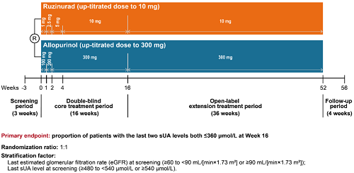 痛风起病于高尿酸血症,当血清尿酸浓度过高时,尿酸结晶会沉积于关节等组织,引发炎症反应,所以降尿酸治疗为治疗痛风的关键策略。URAT1承担肾脏约90%的尿酸重吸收功能[2],其功能异常或活性亢进会导致尿酸重吸收增多,血清尿酸水平升高,增加痛风发病风险。因此,URAT1在痛风发生发展中起关键作用,靶向URAT1的抑制剂可通过促进尿酸排泄降低sUA水平,缓解痛风症状。鲁兹诺雷钠片是918搏天堂自主研发的一种高选择性URAT1抑制剂,在前期的一期、二期研究中,鲁兹诺雷钠片耐受性良好,并显示出显著降低高尿酸血症患者sUA的效果[3]。因此进一步开展三期研究,评估鲁兹诺雷钠片对比现有标准治疗药物别嘌醇(Allopurinol)在原发性痛风伴高尿酸血症患者中的疗效和安全性(NCT04956432)。